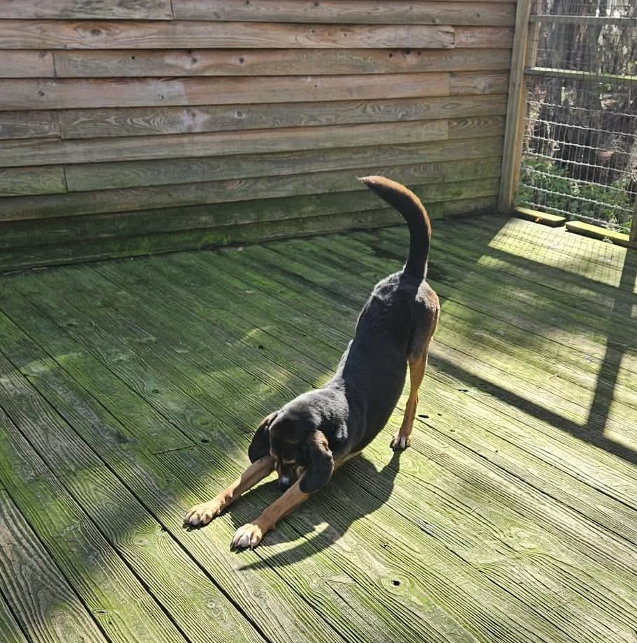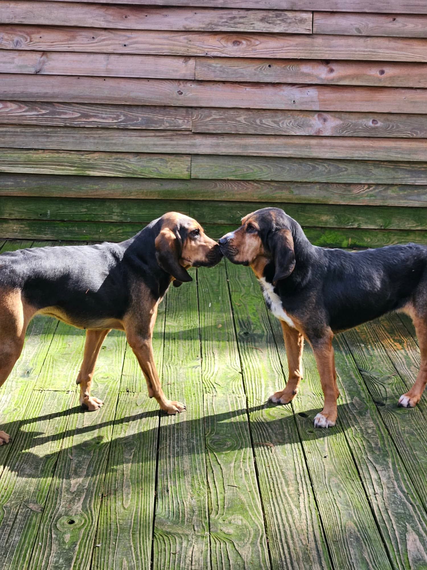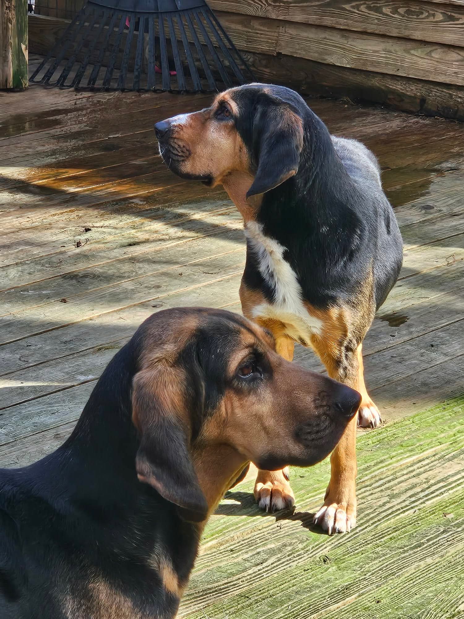 Myrtle Belle is her opposite. She’s gentle, tender, and quietly observant. When she catches a scent, she does this little bowing motion, like her body is politely asking permission to follow her instincts. It’s impossible not to fall in love with her.