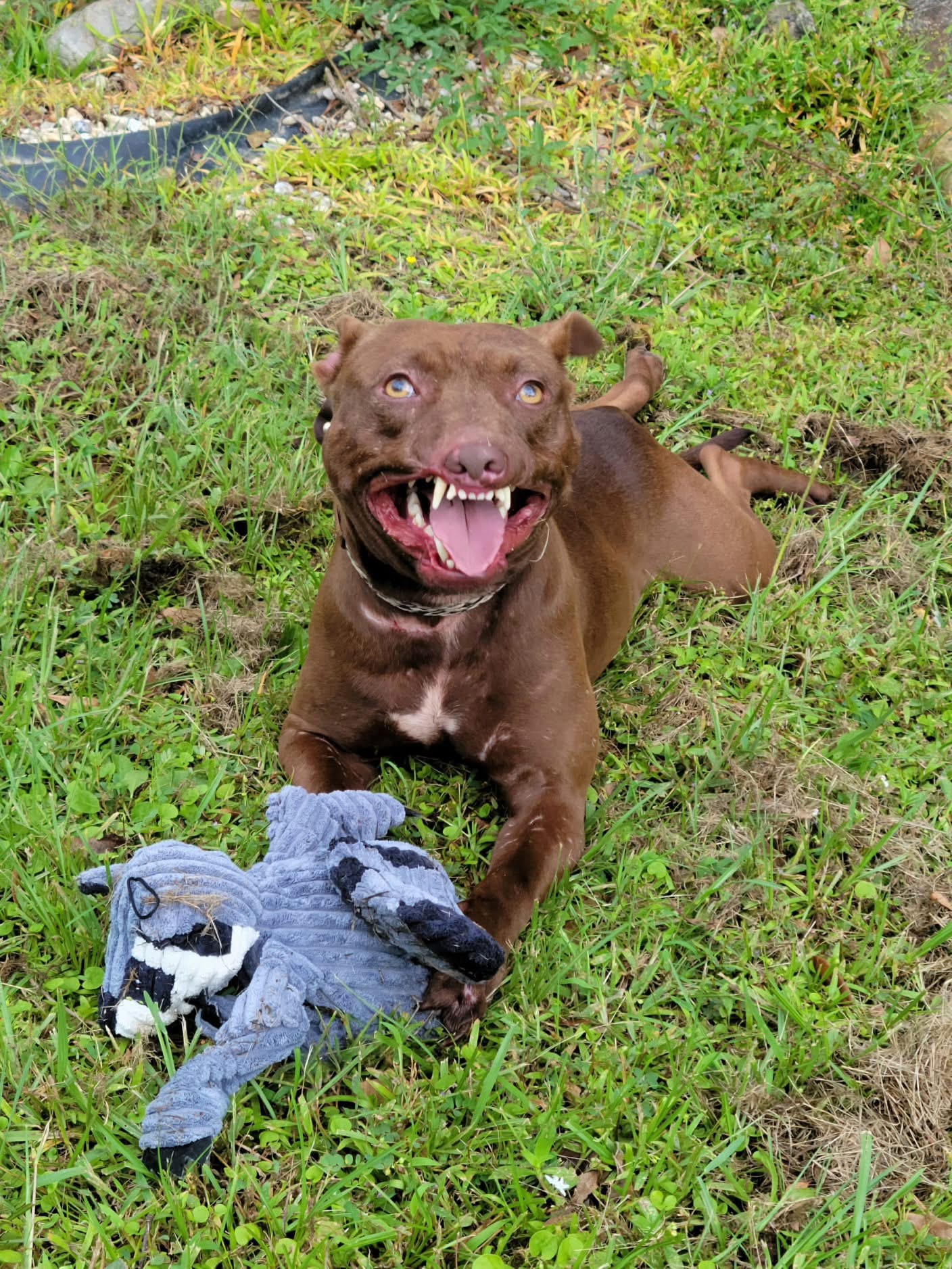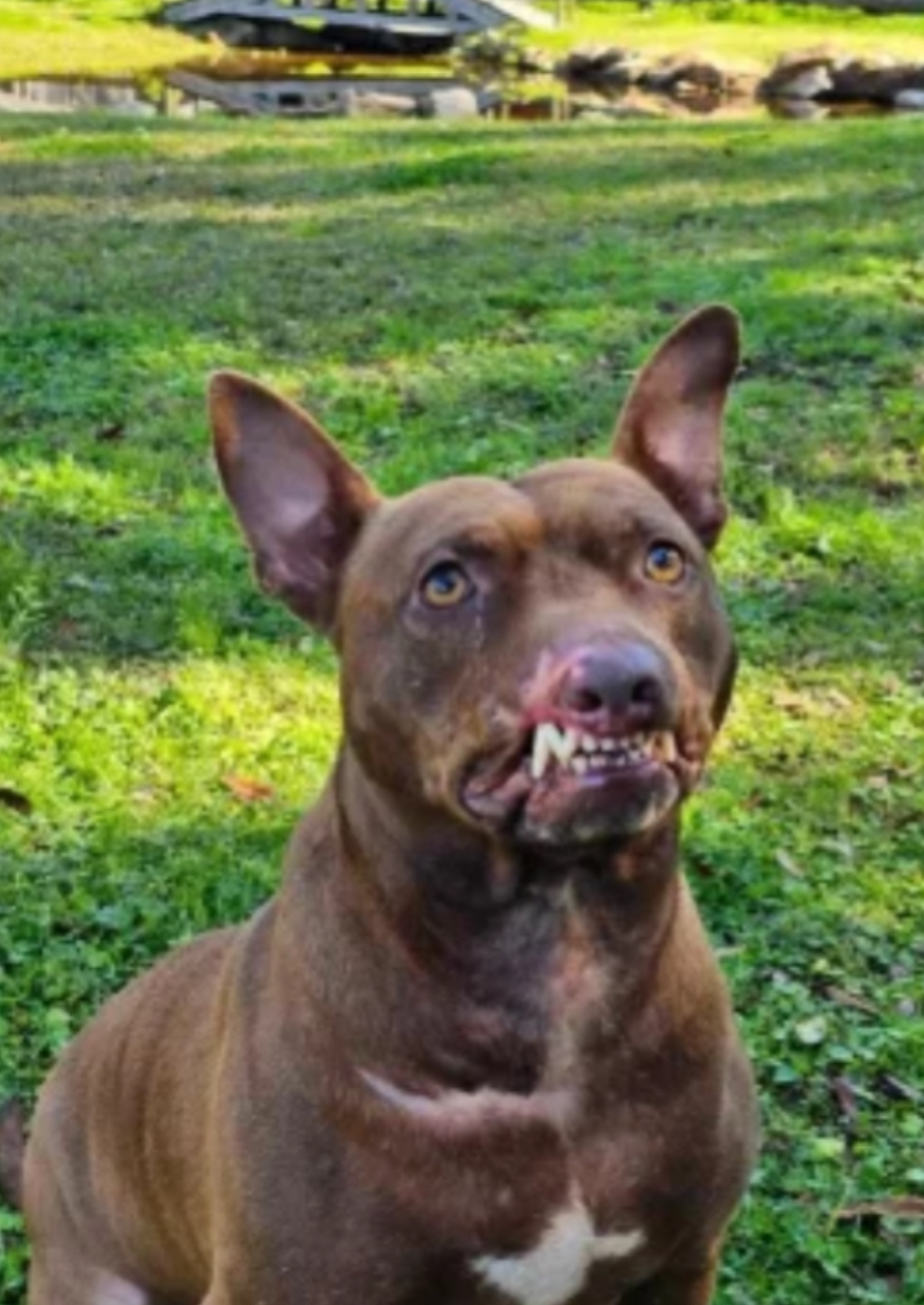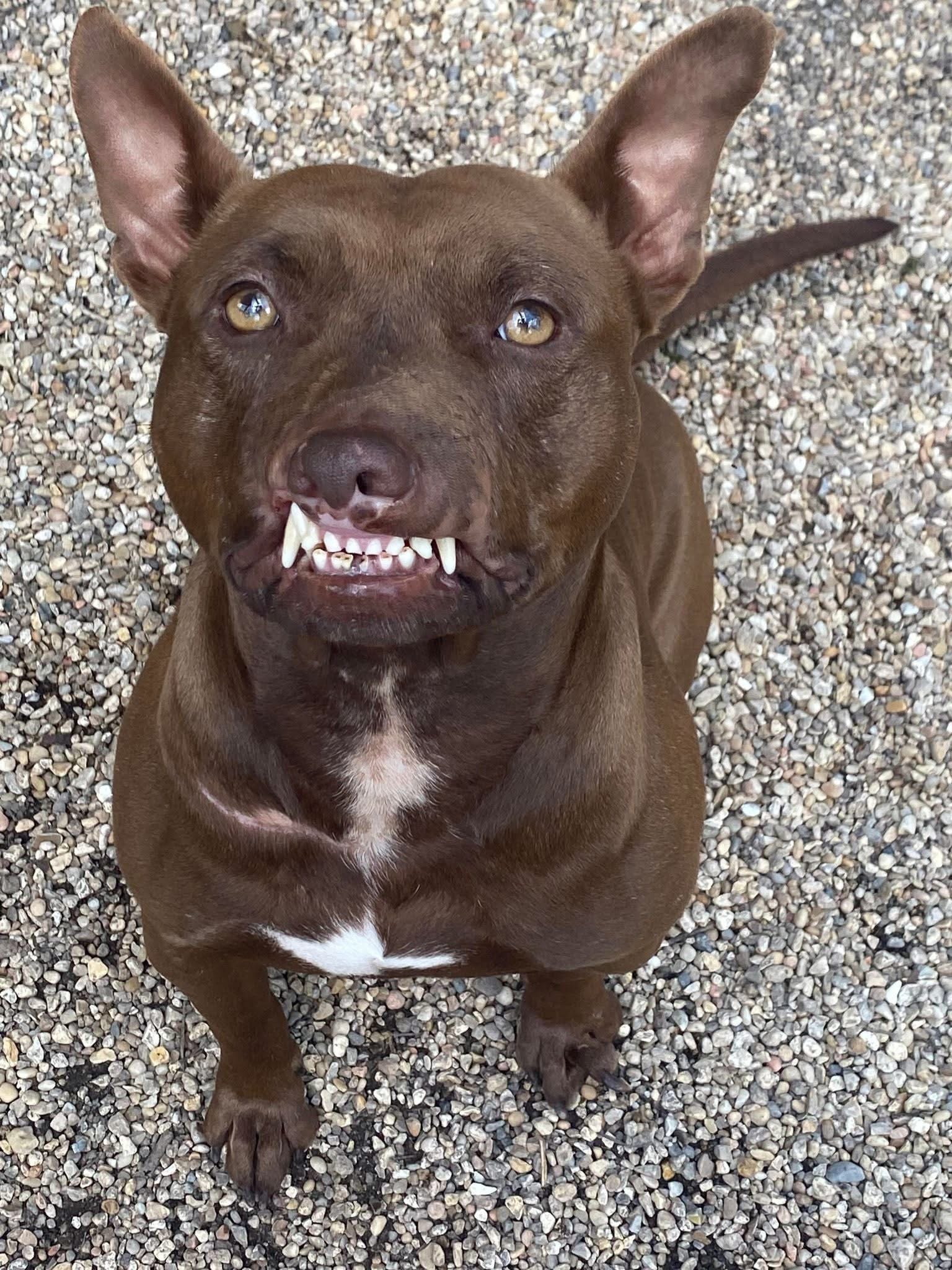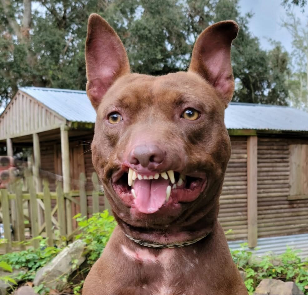 His muzzle/lips have been ripped off which leaves him with a permanent “smile” and while we think it’s endearing, at a glance, most think he is “snarling.” If you only knew….he is a complete mush.
