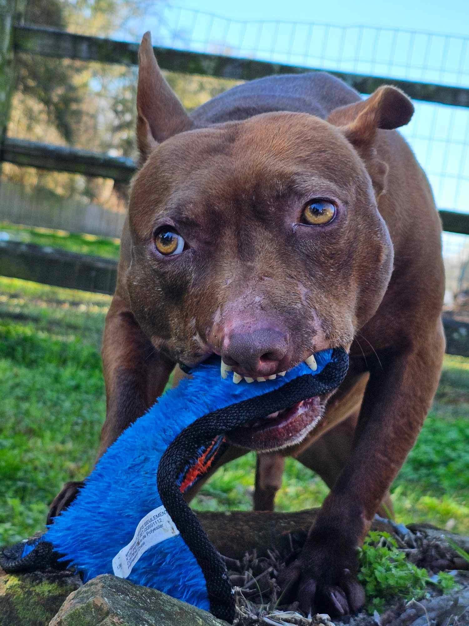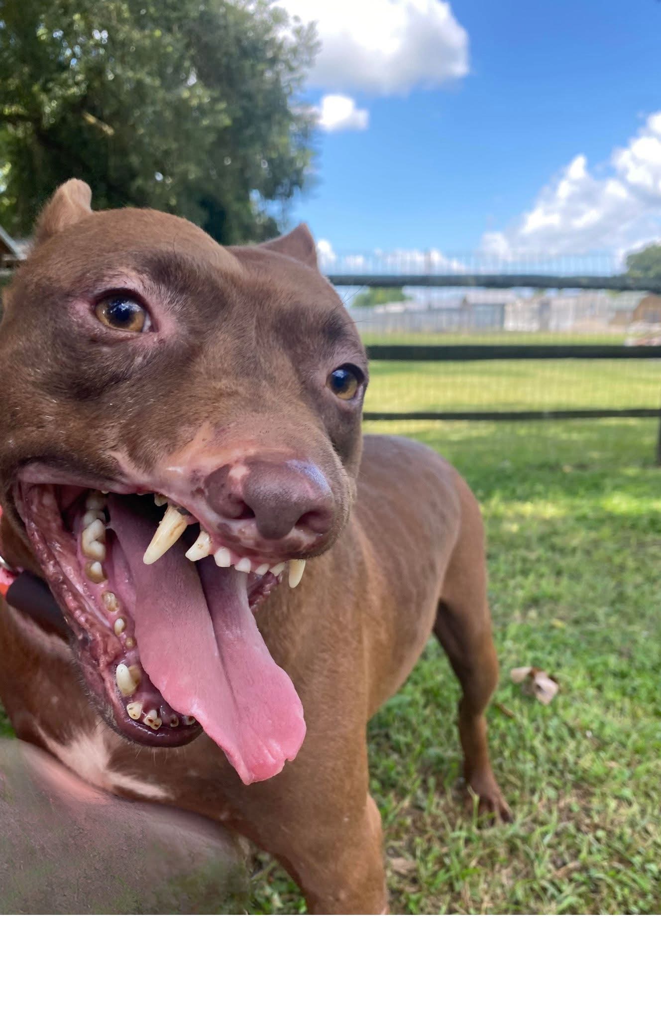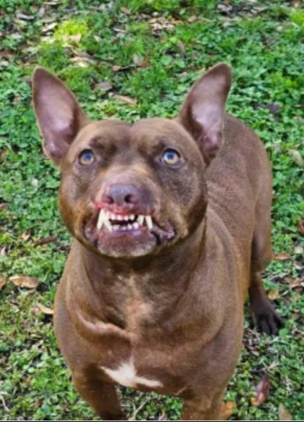 His muzzle/lips have been ripped off which leaves him with a permanent “smile” and while we think it’s endearing, at a glance, most think he is “snarling.” If you only knew….he is a complete mush.